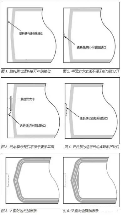 另外,很大一部分醫用紙塑包裝袋,為了輕松地開啟,開啟處的封邊都選擇了V 型封燙(如圖 5)。這樣雖然滿足方便開啟,但在滅菌時,特別是蒸汽滅菌的情況下,容易出現V 型處爆開現象。為了解決這一現象,在V 型的內側凹處增加了一根加強條(如圖6),更能滿足蒸汽滅菌時的需求。 TEL:13912278158